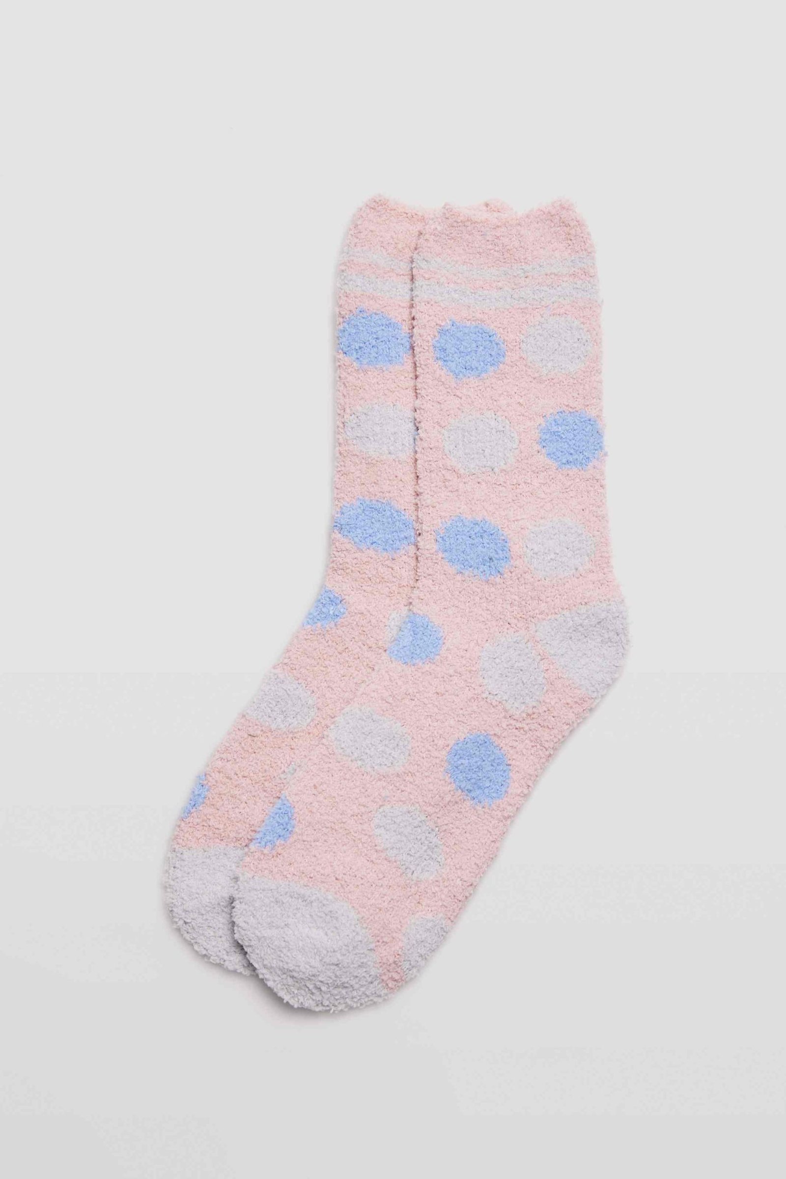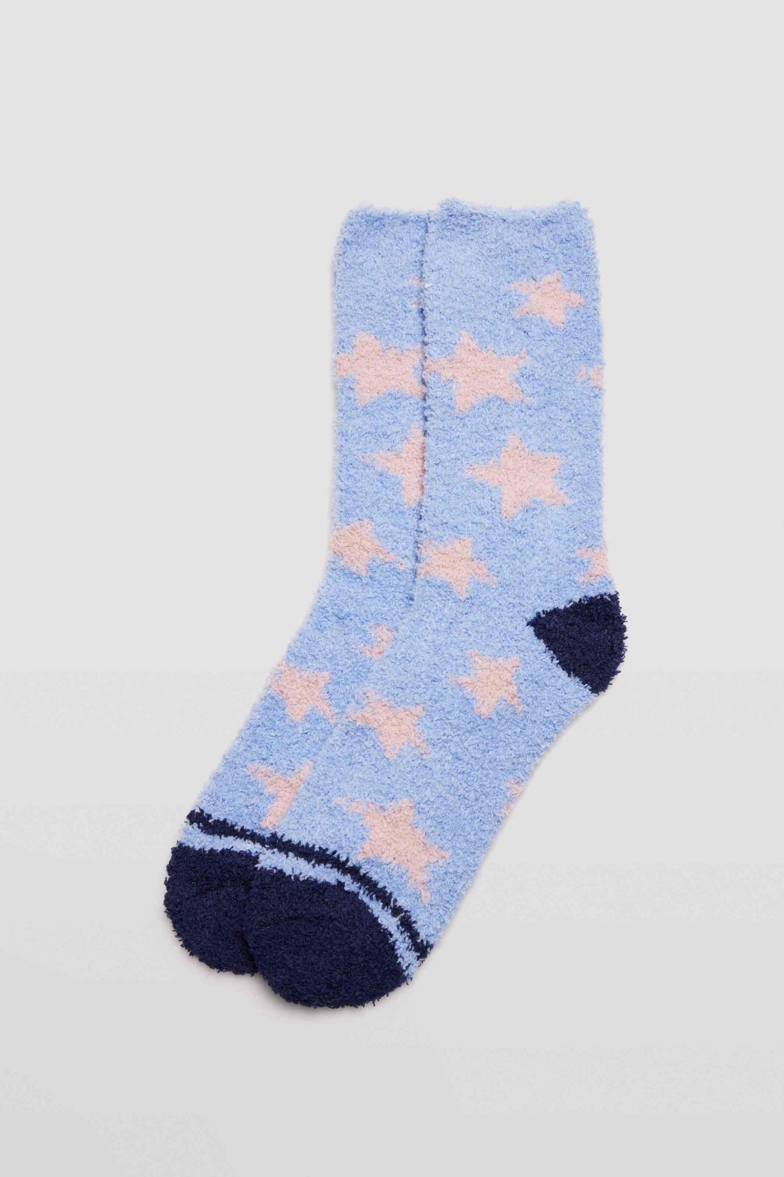 Εμπριμέ κάλτσα με μαλακό λάστιχο στο τελείωμα και σχέδιο ανάλογα το χρώμα: το εκρού έχει σχέδιο σύννεφα, το ροζ πουά, το γαλάζιο αστέρια και το μπλε έχει καρδιές.