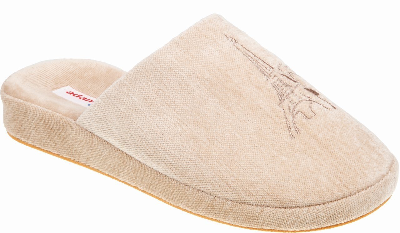 Μονόχρωμη παντόφλα, με κεντημένο σχέδιο ανάλογα το χρώμα: το μπεζ έχει κέντημα τον πύργο του Αϊφελ, το βεραμάν ένα ζευγάρι πουλιά.