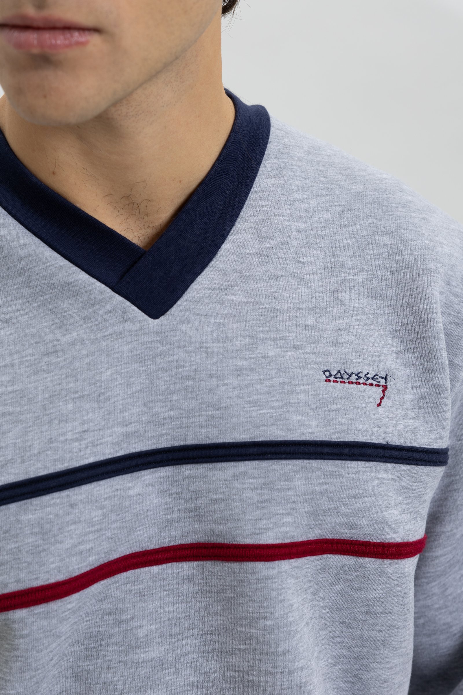 Το πάνω μέρος είναι μπλούζα με κόψιμο “V” στη λαιμόκοψη.