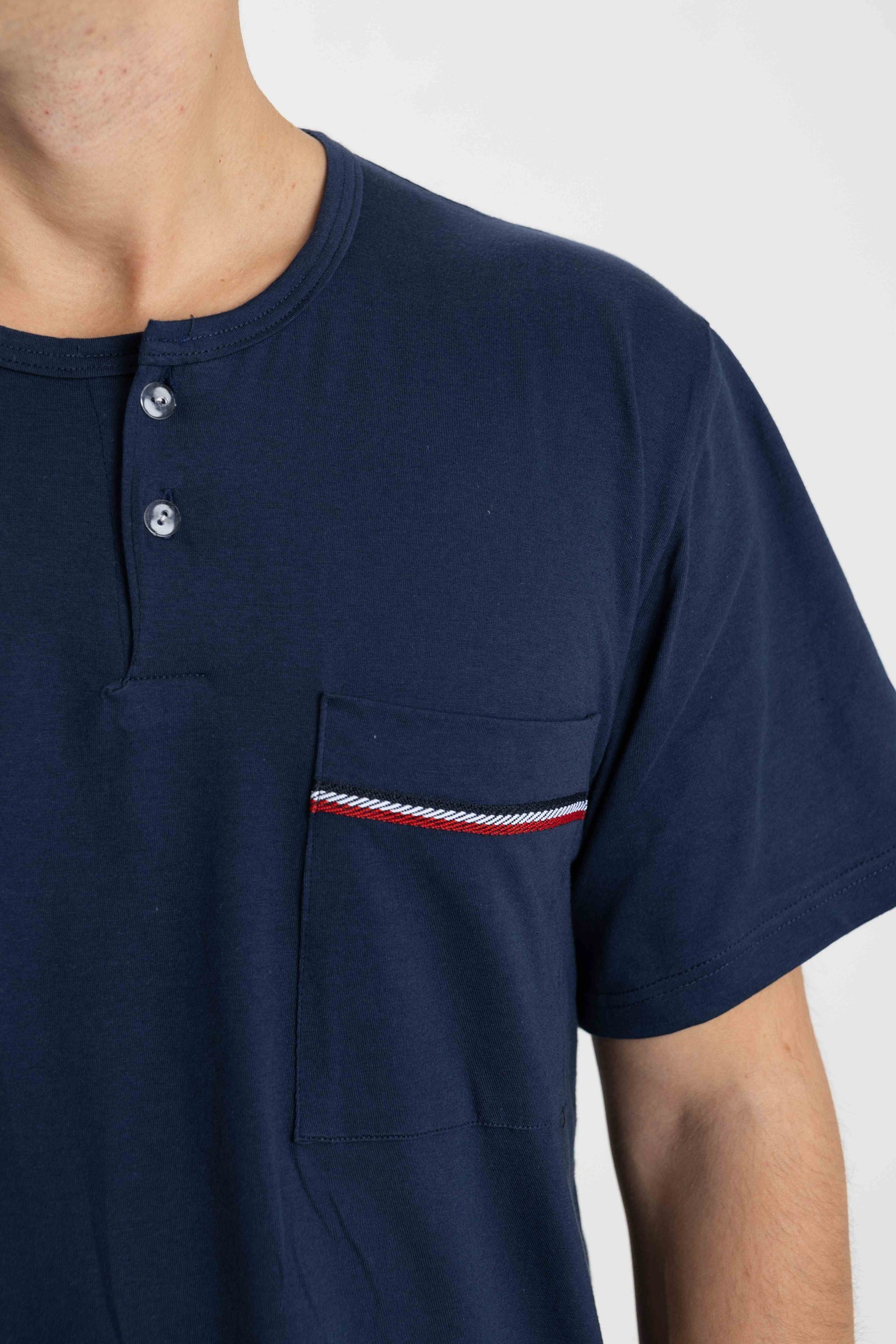 Τετράγωνη τσέπη στο ύψος του στήθους με οριζόντιο, δίχρωμο ρέλι.