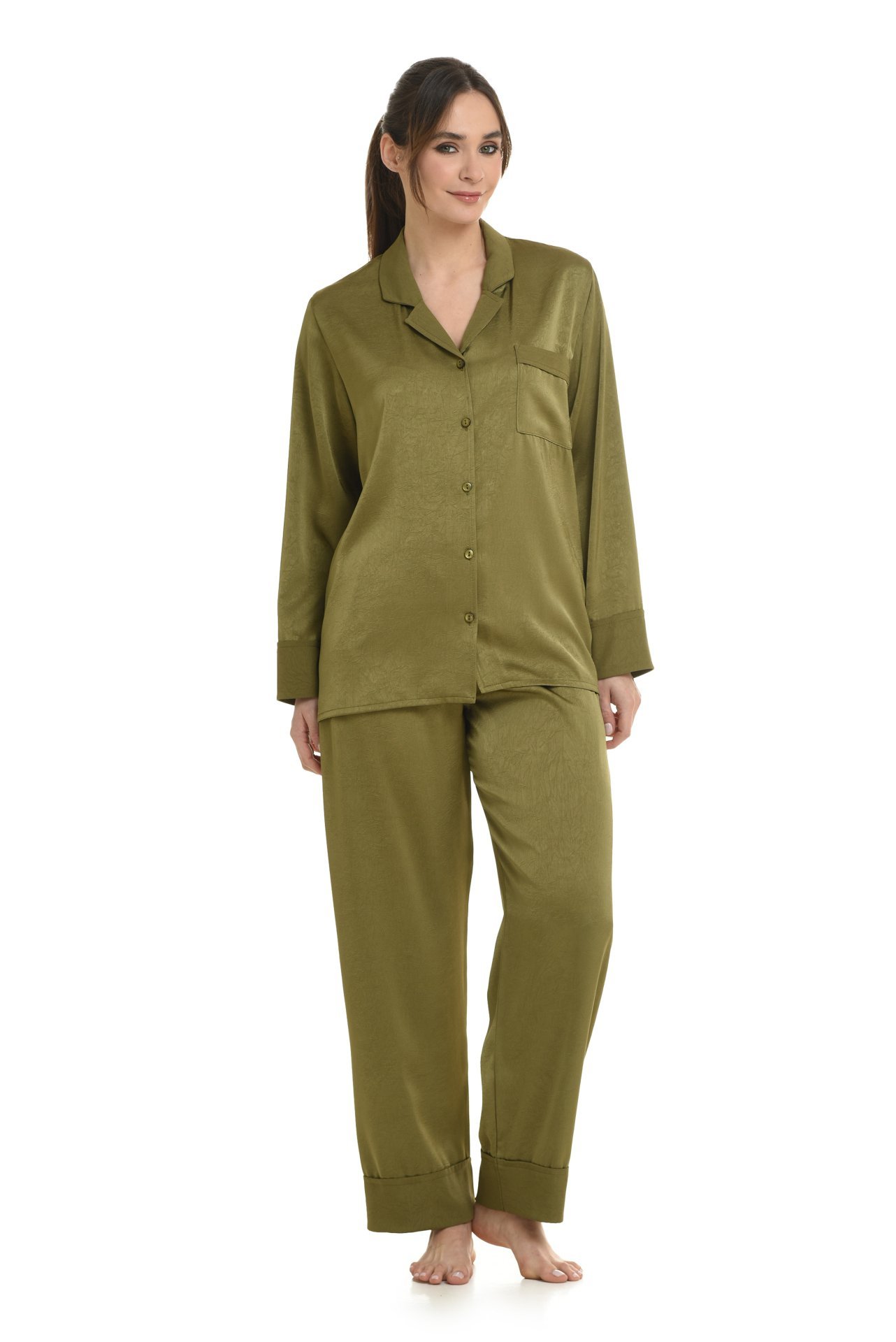 Σατέν πυτζάμα, με κουμπωτό σακάκι στο πάνω μέρος και μακρύ παντελόνι με λάστιχο στη μέση