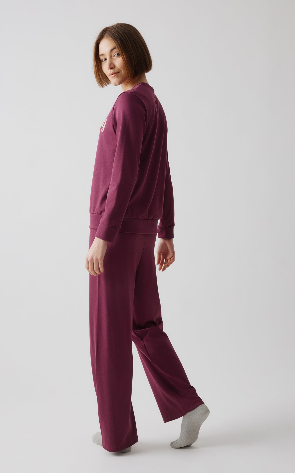 Το κάτω μέρος είναι μονόχρωμο, μακρύ παντελόνι με μαλακό λάστιχο στη μέση.