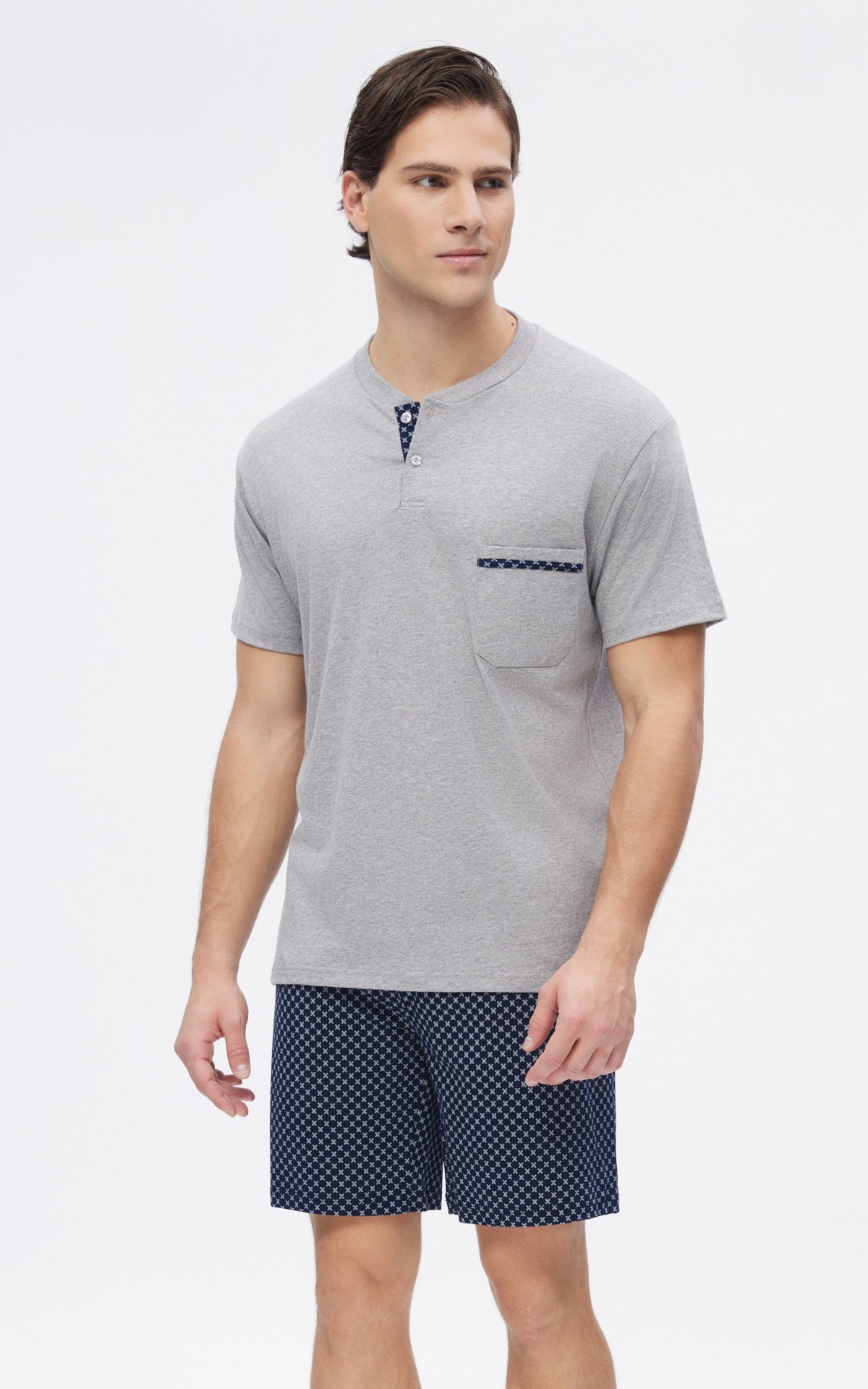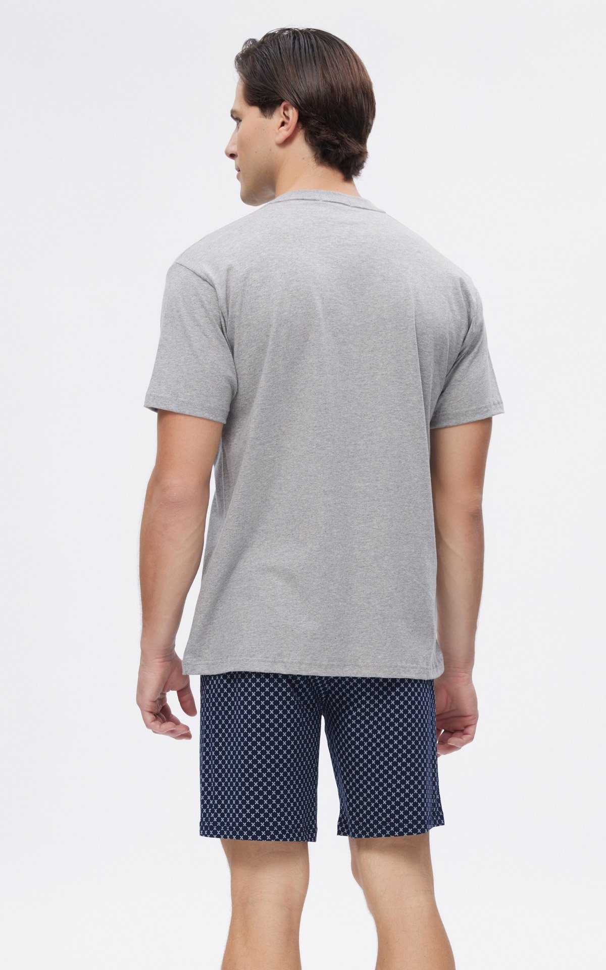 Το σορτς είναι εμπριμέ, με σχέδιο σταυρούς και μήκος περίπου στο μέσο του μηρού.