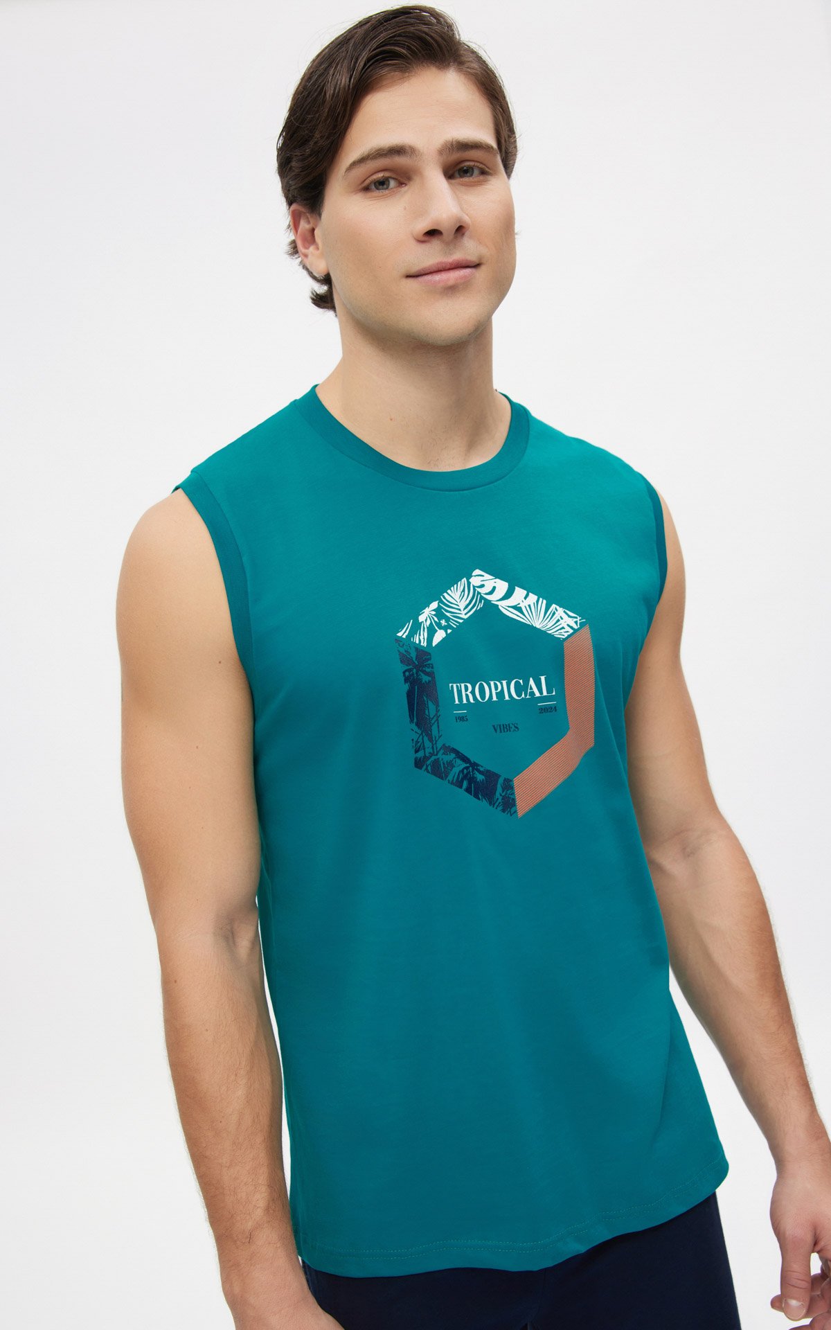 Τύπωμα με τροπικά δέντρα και γράμματα στο κέντρο της μπλούζας.