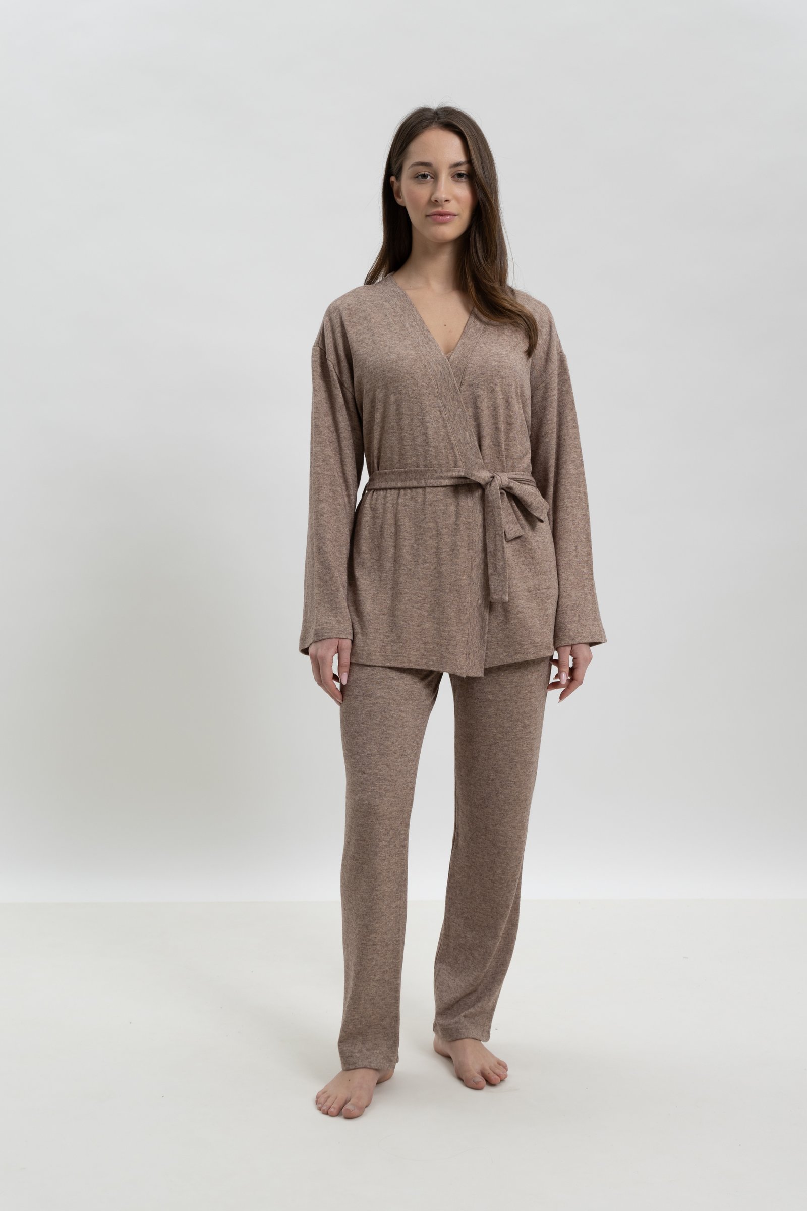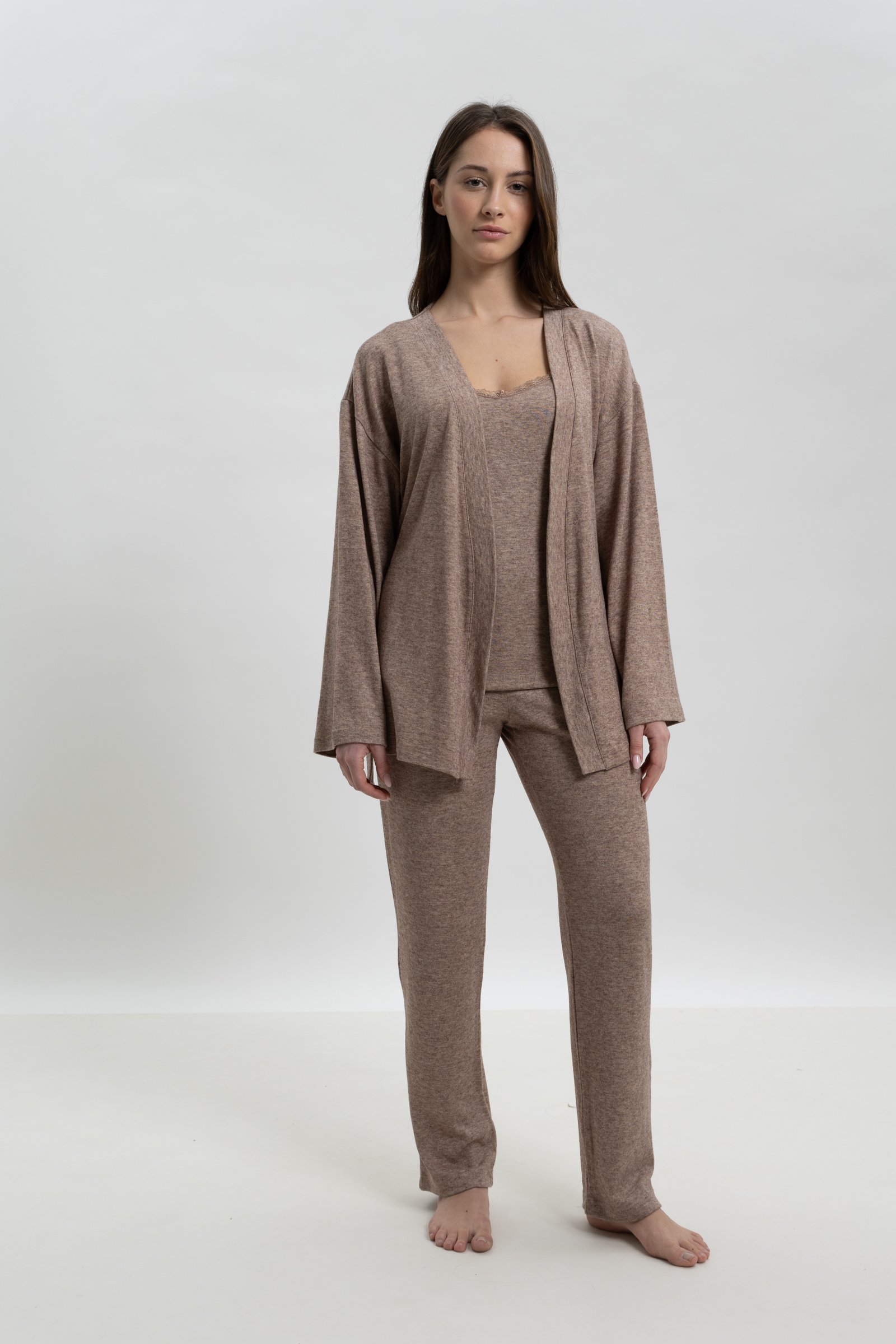 Το σετ αποτελείται από ρόμπα, τοπ και παντελόνι.