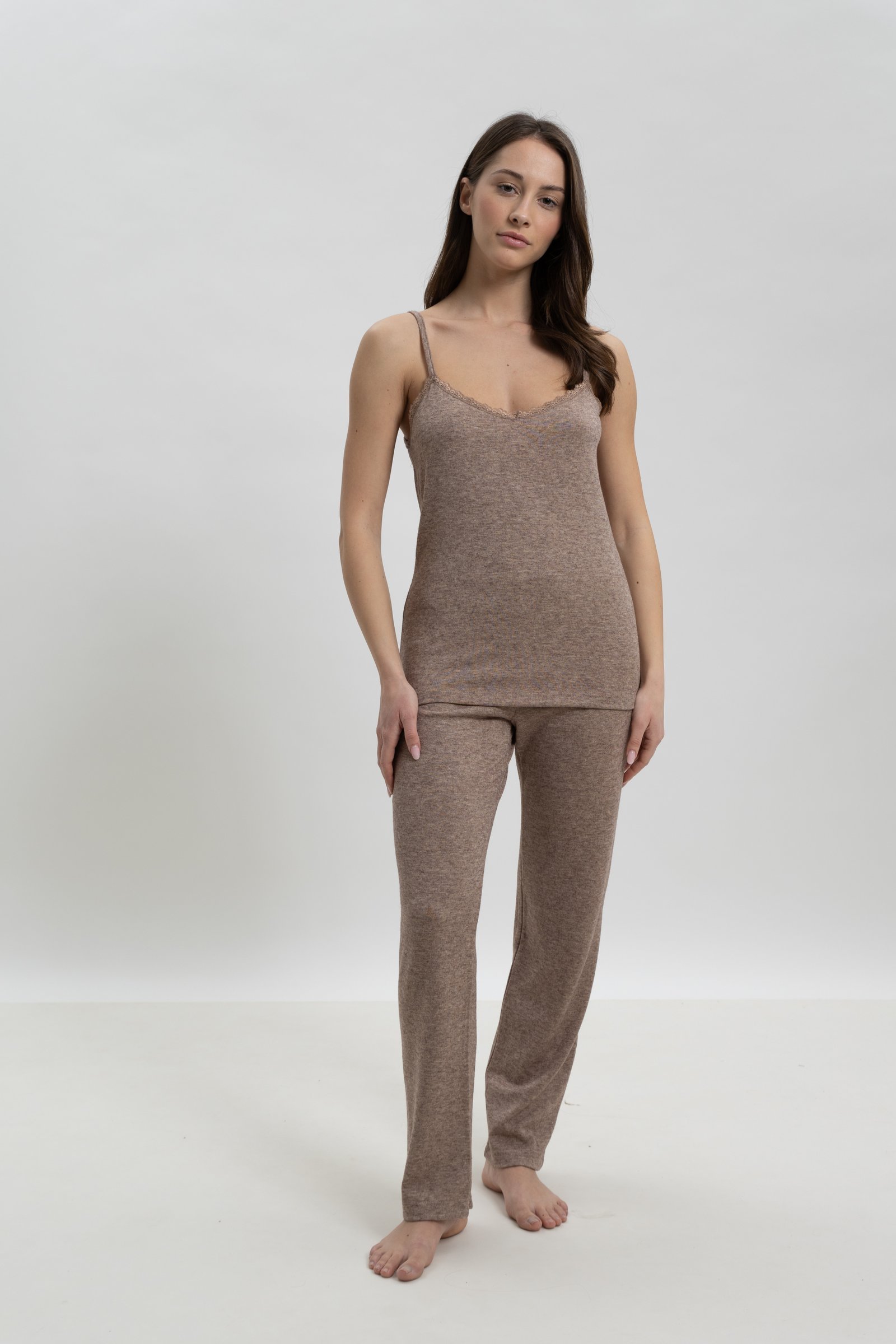 Το τοπ είναι μονόχρωμη μπλούζα με τιράντες και τρέσα δαντέλα στο μικρό “V” της λαιμόκοψης.