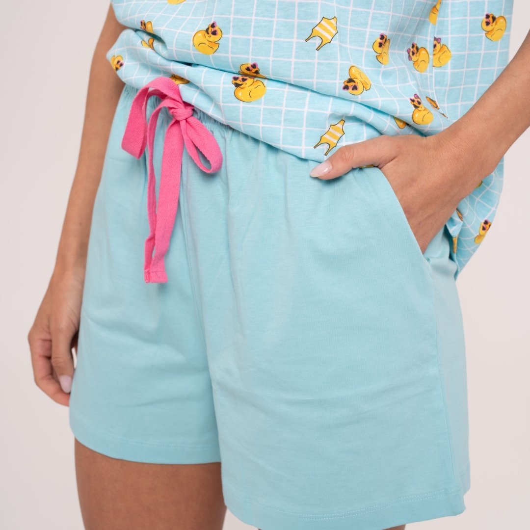 Το κάτω μέρος είναι μονόχρωμο σορτς με εσωτερικό λάστιχο και κορδόνι στη μέση.